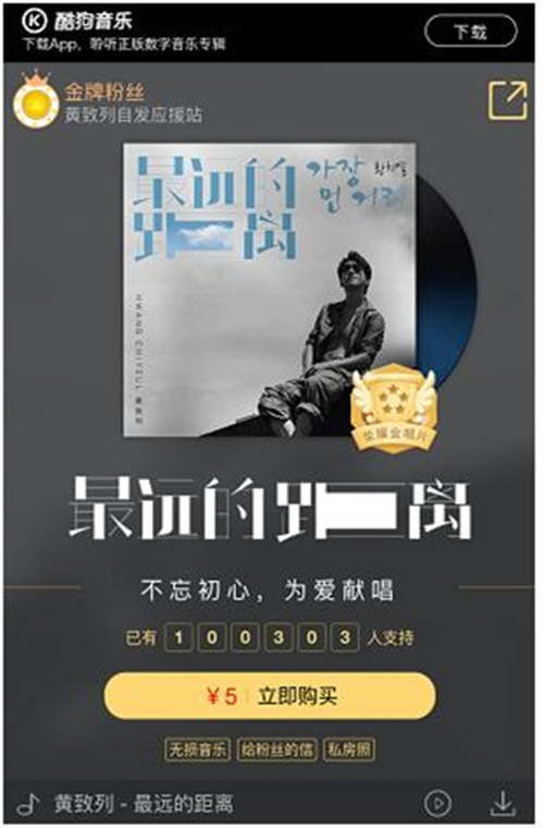연예인의 성공은 팬들의 응원을 떠날 수 없다. 디지털 음원 플랫폼은 팬들의 사랑을 잘 담아내는 장소가 될 것이다. 쿠거우 뮤직에는 황치열 팬들이 한마음 한뜻으로 뭉쳐있고 그중 열혈팬은 6.8만 위안(한화 약 1천200만원)을 들여 그의 앨범을 구매했다. 이러한 팬들은 황치열이 중국 시장에서 지속! 적으로 활동할 수 있는 버팀목이 될 것이다.
