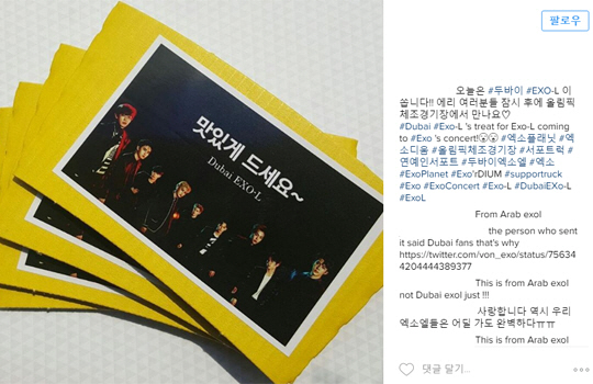 그런데 아랍에미리트(UAE) 두바이의 팬들이 한국에서 열리는 엑소 콘서트를 관람하는 팬들을 위해 커피 및 아이스크림 차량을 지원하고 나선 것. 아시아 한복판을 가로지르는 '아이돌 사랑의 좋은 예'다.