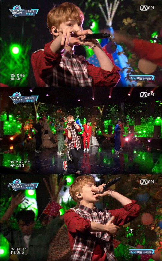 버논은 화이트 청재킷으로 에릭남과의 커플룩을 보여줬다. 오버핏의 흰 청재킷은 버논의 흰 피부와 잘 어우러져 멋짐이 두배가 되는 효과를 나타냈고, 이에 매치한 패텬 티셔츠의 화려함을 적절하게 잡아주는 역할 또한 완벽하게 해냈다. 여기에 매치한 블랙 반바지와 화이트 삭스, 스니커즈는 버논의 자유분방함을 고스란히 드러내주는 아이템이 됐다.