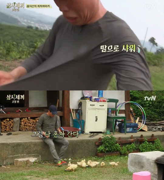 하지만 0.5KM라던 산 정상을 나오지를 않았고, 심지어 유해진은 더운 날씨에 땀으로 샤워를했다.