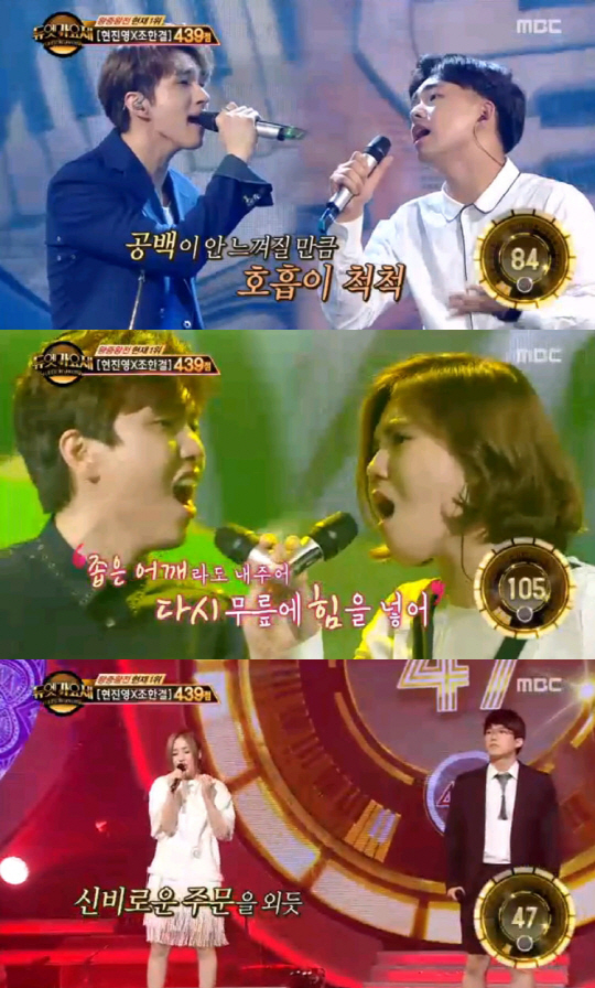 [스포츠조선닷컴 정유나 기자] '듀엣가요제' 현진영 조한결 팀이 왕중왕전 1라운드 대결을 1위로 마무리했다.