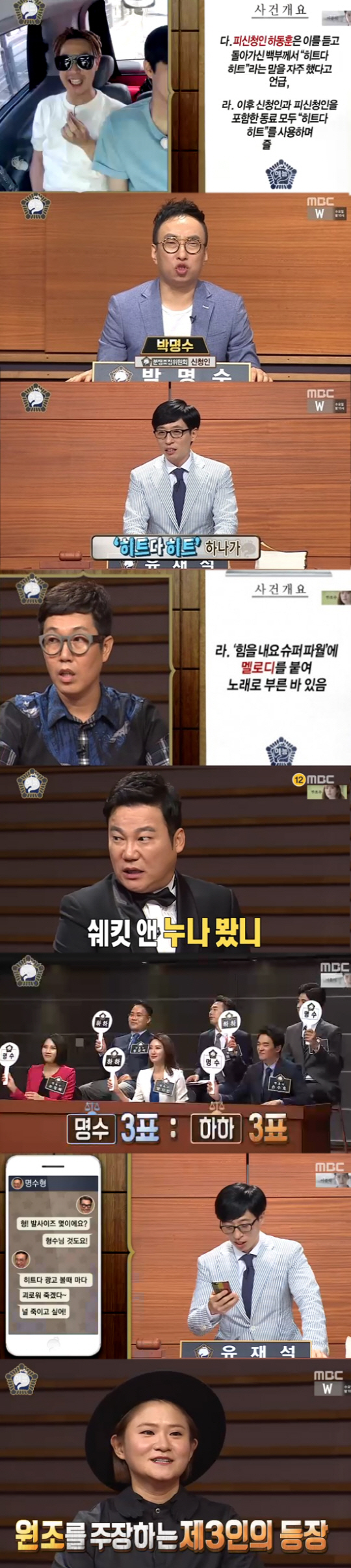 이에 이날 박명수는 "내가 먼저 '세계의 히트'라는 말로 시작했다"며 저작권을 주장했다. 그러면서 그는 자신의 유행어를 무단으로 사용한 데 대해 하하를 상대로 손해배상을 청구했다. 하하가 '히트다 히트' 사용에 대해 사전 동의를 구하지 않고 광고 계약까지 부당 이익을 취했다는 것.