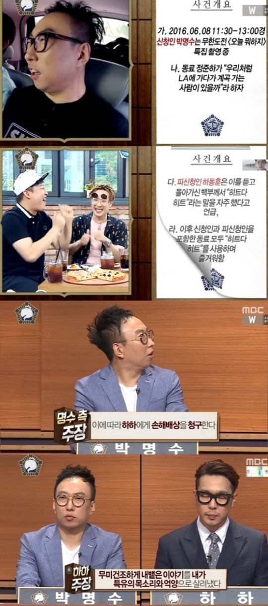 이에 정준하, 양세형은 하하 측의 손을, 광희는 박명수의 손을 들어줬고, 변호사들의 의견은 3대 2로 하하가 1표더 많았다.