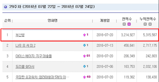 영진위 통합전산망에 따르면 '부산행'은 주말 3일간 321만4927명을 모으며 누적 관객수 531만5567명을 동원해 주말 박스오피스 압도적 1위를 기록했다. 또 역대 최초로 개봉 첫 주 500만 이상 관객을 모으는 기록을 세웠다.