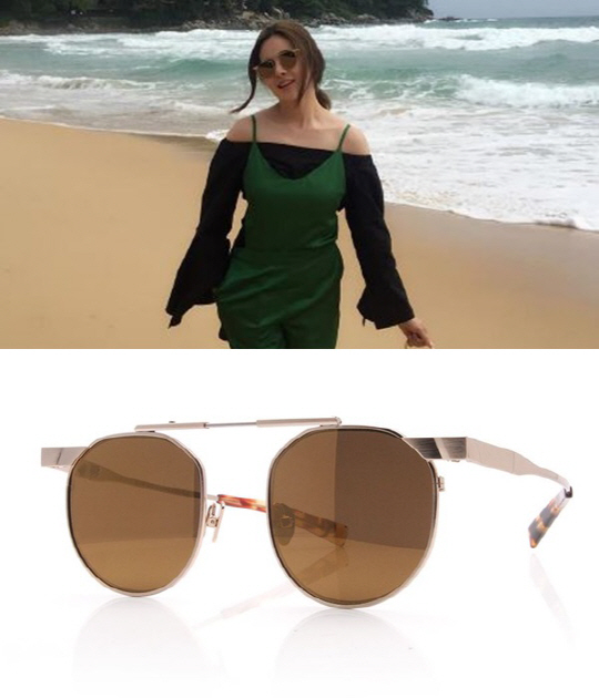 아이비가 착용한 선글라스는 볼드한 전면부와 메탈의 조화로 상반되는 듯한 메탈 콤비 프레임은 중성적인 매력을 어필하고 스타일리쉬한 매력을 배가시킨다. 또한 어느 착장에나 부드럽게 소화할 수 있는 밝은 브라운 컬러로 활용도가 높은 제품이라 할 수 있겠다.