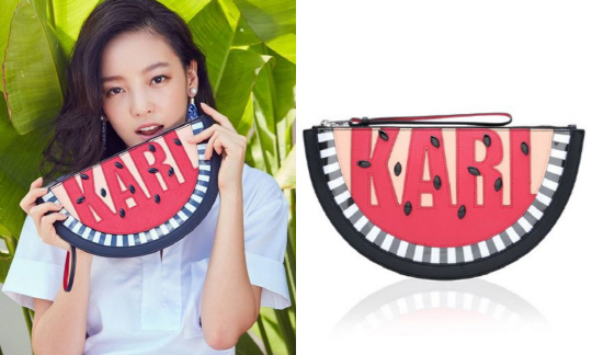 구하라는 깔끔한 화이트 원피스에 수박모양과 KARL 로고 레터링을 믹스해 위트있는 디자인의 클러치 백을 선택했다. 윗부분 여밈 실버 지퍼 디테일로 세련되게 마무리 돼 귀엽지만 고급스러워 보이는 룩을 연출했다. 한 손에 들어오는 유니크한 디자인의 클러치로 작지만 큰 영향력을 선사할 수 있을 것.