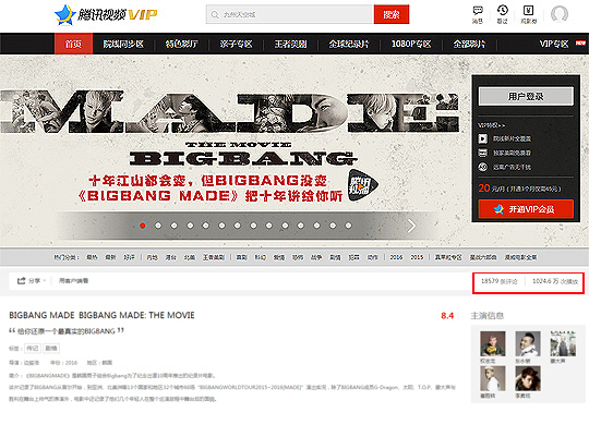 영화 '빅뱅 메이드(BIGBANG MADE)'는 25일 0시 중국 온라인 영상 사이트 텐센트에 유료 공개된지 단 3시간만에 조횟수 800만을 돌파했다. 25일 오후 6시 20분 1024만 명이 넘는 인원이 '빅뱅 메이드'를 관람했다. 리뷰 수도 1만8500여개에 달한다. 빅뱅의 뜨거운 중국내 인기를 증명한 셈.