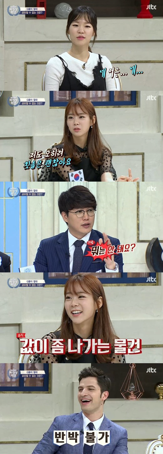 그러면서 한승연은 "정이 들지 않은 소모품은 공유가 가능하다"며 "값이 나가는 물건은 공유가 힘들 것 같다"고 말해 웃음을 안겼다. <스포츠조선닷컴>