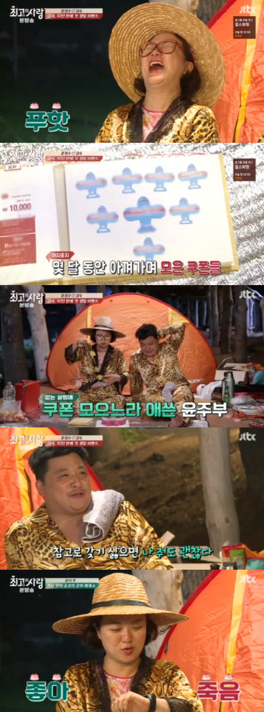 몇 달 동안 쿠폰을 모은 윤정수의 정성에 감동한 김숙은 "오빠가 쿠폰을 준 건 다 준 거라고 할 수 있는데 정말 고맙다. 나한테 넘어온 것 같다"고 말해 웃음을 안겼다.