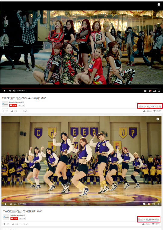 한편 트와이스가 지난 4월 발표한 '치어 업(Cheer Up)'은 발표 95일만인 27일 현재 6539만뷰를 내달리고 있다.