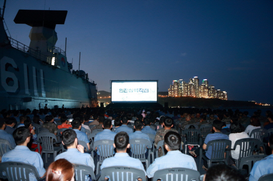 그간 장병 복지 차원에서 함선 실내 공간 등에서 영화를 상영한 경우는 있었지만, 갑판 위에서 대규모 영화 시사회를 진행한 경우는 이번이 처음이다. 이번 시사회는 해군 첩보부대의 활약상을 그린 '인천상륙작전'의 감동을 군함 위에서 더욱 생생하게 느껴보는 취지에서 기획됐다. 국내 최초 함상 시사회를 위해 해군 측은 가로 12m, 세로 6m에 달하는 대형 스크린을 설치해 눈길을 끌었다.