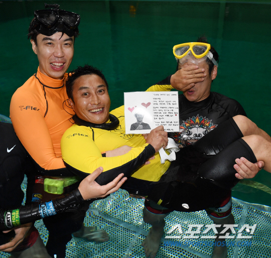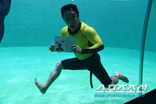 그나마 하늘보다는 물 속이 낫겠지 싶어, 수중 촬영을 전문으로 하는 수작 스튜디오를 찾았습니다. 웹예능 '병만TV' 첫 생방송 촬영을 진행했던 곳인데, 이 곳에 김병만이 자주 출몰한다는 제보를 접했거든요. 래쉬가드는 기본, 초대장에 코팅까지 하며 철저하게 준비를 마친 뒤 김병만을 잡으러 나섰습니다.