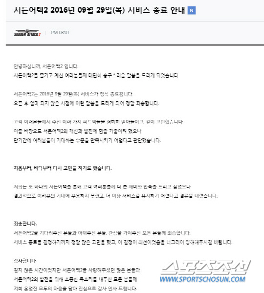 물론 부정적 입장에서 보는 이들에서 일종의 '꼬리 자르기'로 해석할 가능성이 없는 것은 아니지만, 서든어택2라는 무게를 보면 넥슨에서 이렇게 서비스 종료를 쉽게 결정할 수 있는 타이틀이 아니기에 그 결정이 쉽지 않았을 것을 가늠하게 한다.