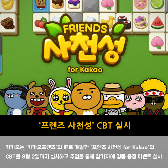 카카오는 '카카오프렌즈'의 IP로 개발한 '프렌즈 사천성 for Kakao'의 CBT를 8월 2일까지 실시하고 추첨을 통해 참가자에 경품 증정 이벤트 실시