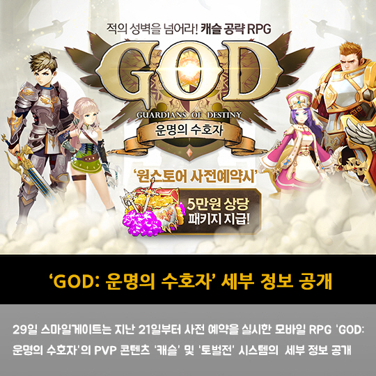 29일 스마일게이트는 지난 21일부터 사전 예약을 실시한 모바일 RPG 'GOD: 운명의 수호자'의 PVP 콘텐츠 '캐슬' 및 '토벌전' 시스템의 세부 정보 공개