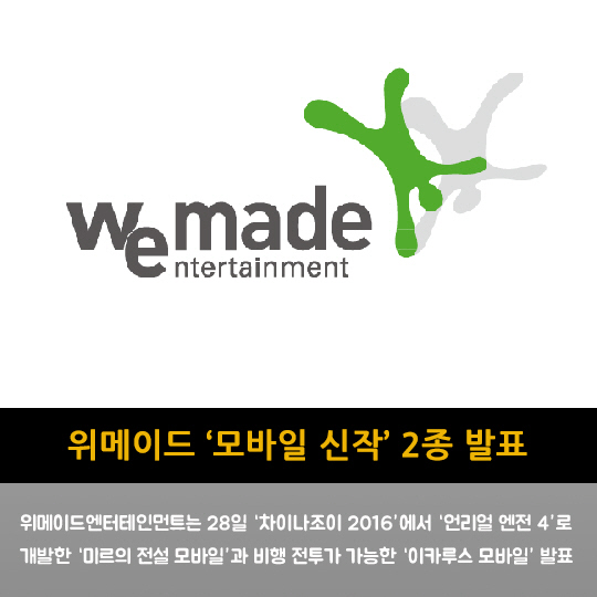 위메이드엔터테인먼트는 28일 '차이나조이 2016'에서 '언리얼 엔전 4'로 개발한 '미르의 전설 모바일'과 비행 전투가 가능한 '이카루스 모바일' 발표