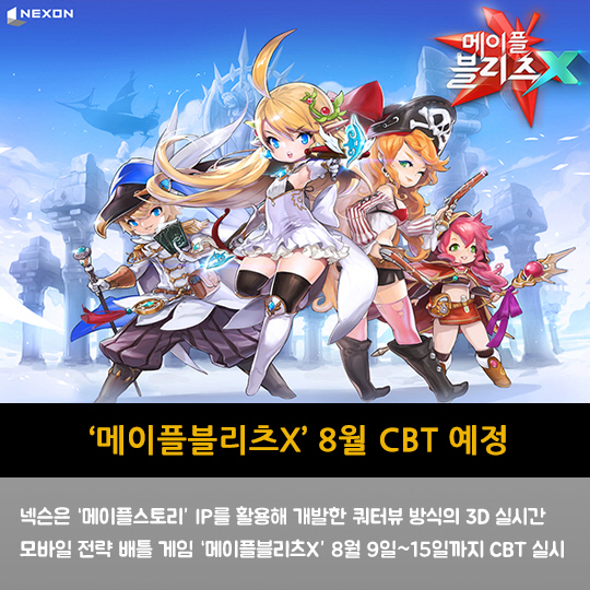 넥슨은 '메이플스토리' IP를 활용해 개발한 쿼터뷰 방식의 3D 실시간 모바일 전략 배틀 게임 '메이플블리츠X' 8월 9일~15일까지 CBT 실시