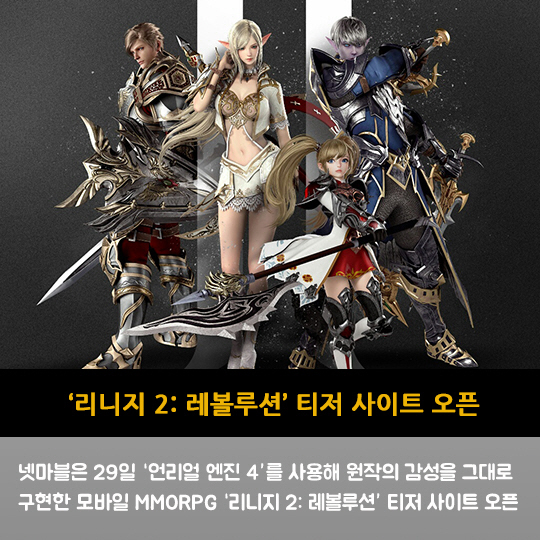 넷마블은 29일 '언리얼 엔진 4'를 사용해 원작의 감성을 그대로 구현한 모바일 MMORPG '리니지 2: 레볼루션' 티저 사이트 오픈