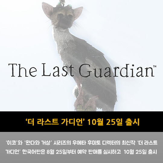 '이코'와 '완다와 거상' 시리즈의 우에타 후미토 디렉터의 최신작 '더 라스트 가디언' 한국어판은 8월 25일부터 예약 판매를 실시하고 10월 25일 출시