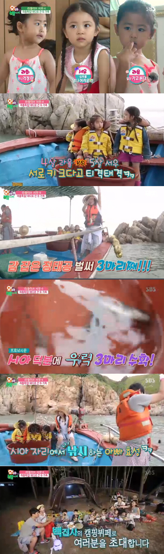 라희 라율과 서우는 각각 아빠 임효성과 엄마 서우를 응원하며 신경전을 펼치는 모습. "집에 반지가 있다", "내가 더 키가 크다" 등의 아이들만의 유치한 대결로 보는 이의 엄마미소를 유발했다. 우럭은 공교롭게도 큰 소리친 임효성이 아닌 정시아의 미끼만 물었다. 정시아는 순식간에 3마리 고기를 잡고 흥분했다.