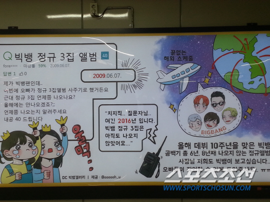 급기야 팬들은 최근 지하철 6호선 합정역에 드라마 '시그널'을 패러디한 광고를 걸었다. 2009년에 올려진 질문과 "여긴 2016년입니다. 빅뱅 정규 3집은 아직도 나오지 않았어요"라는 답변에서 8년간의 안타까움이 절절히 드러난다. 한숨만 땅이 꺼지라 쉬는 모습이 절로 연상된다.