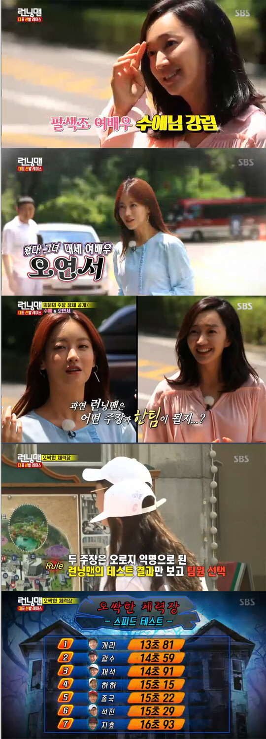 이날 주장으로는 영화 '국가대표2'의 주역 수애와 오연서가 출연했다. 두 주장은 익명으로 된 런닝맨 기록 테스트 결과만으로 팀원을 선택하게 된다.