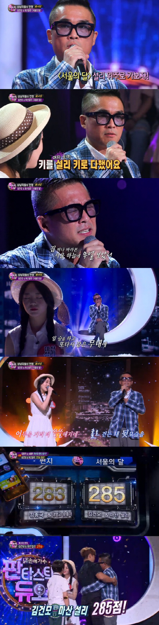이날 타이틀 방어를 위해 나선 김건모와 '마산 설리'의 무대는 '서울의 달'이었다. 김건모는 "마산 설리가 가장 잘 부를 수 있는 노래가 무엇일까 생각하다 첫인상 때 불렀던 '서울의 달'을 고르게 됐다"고 선곡 이유를 밝혔다. 이어 "마산 설리에 맞춰 중간 애드리브 부분을 제외하고는 모두 여자키로 편곡했다"고 말해 스튜디오를 술렁이게 했다.