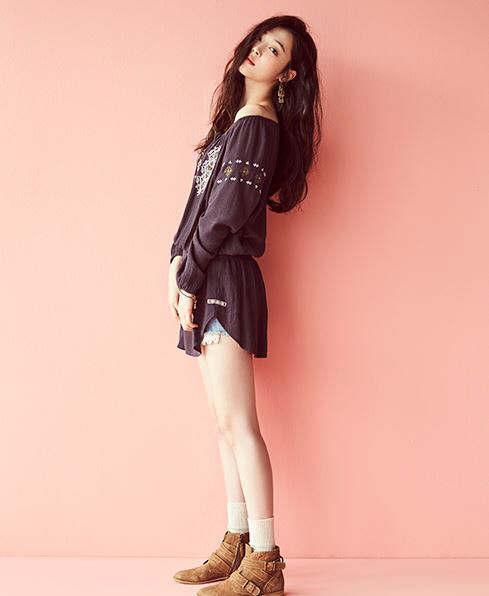 설리는 에스닉한 오프숄더 형태의 보헤미안 원피스를 착용해 자신의 페미닌한 무드를 강조했다. 그리고 원피스에 레이스 매칭 쇼츠를 함께 매치해 아찔한 각선미를 어필했고 브라운 컬러의 멋스러운 자수 버클 워커로 완벽에 가까운 원피스 룩을 완성시켰다.