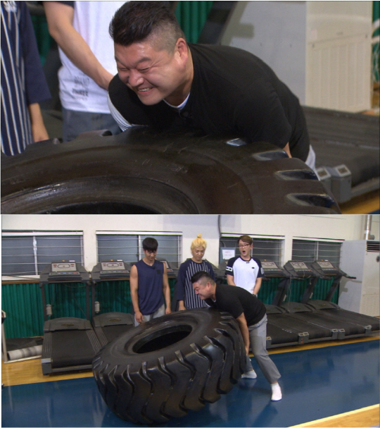 오는 2일 방송될 KBS 2TV '우리동네 예체능'에서는 원조 천하장사 강호동과 아이돌계 천하장사 조타가 무게 300kg의 거대한 타이어 들기에 도전했다.