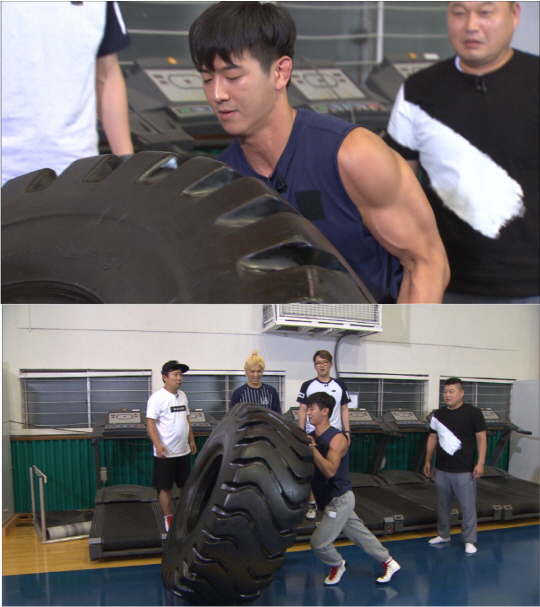 성인 남자의 키만 한 크기의 어마어마한 타이어의 비주얼에 놀란 멤버들은 눕혀진 타이어를 들어올리려고 시도해 봤지만 "손가락도 들어가지 않는다"며 엄두조차 내지 못했다. 하지만 지켜보던 조타는 300kg 타이어를 이리저리 살펴보더니 온몸의 힘을 모아 타이어를 세우는데 성공해 국가대표 선수들조차 깜짝 놀라게 만들었다.