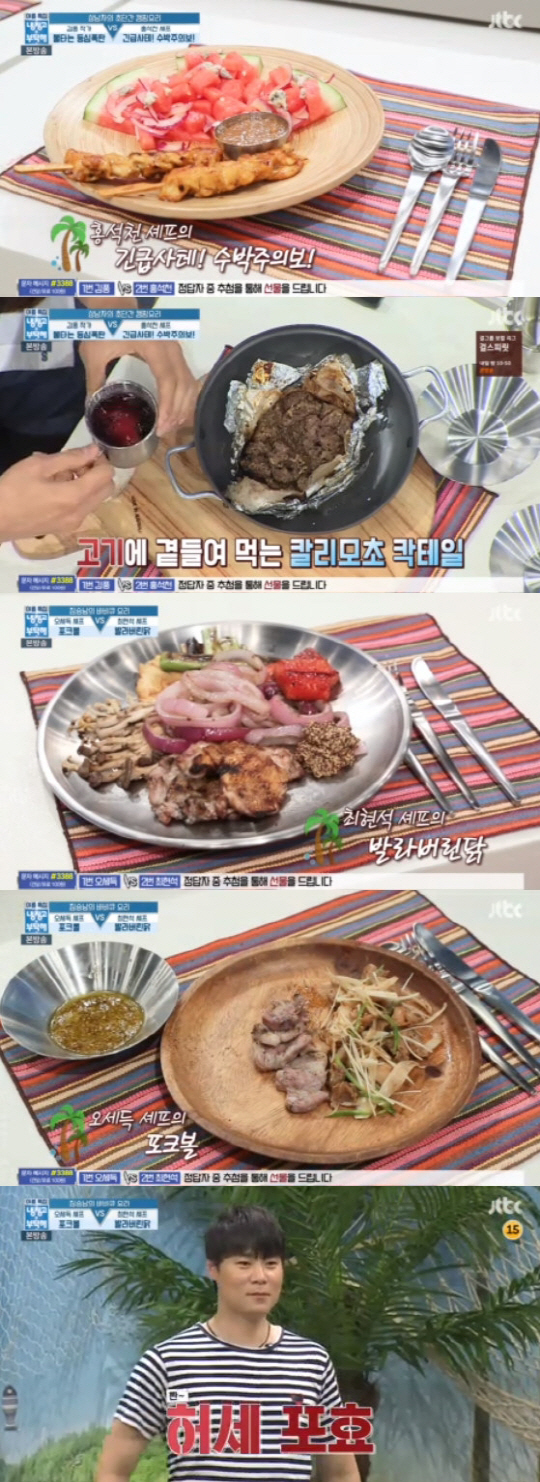 최현석은 먹기 좋게 닭의 살만 발라 그릴에 구운 스테이크 '발라버린닭'을 만들었다. 특히 최현석은 수박을 굽는 독특한 요리로 모두의 시선을 사로잡았다. 오세득은 삼겹살을 적당한 크기로 썰어 양파로 감싸 숯에 구운 '포크볼' 요리와 함께 골뱅이 파무침도 곁들였다. 두 셰프는 캠핑요리 대결답게 그릴을 이용한 요리를 선보였다.