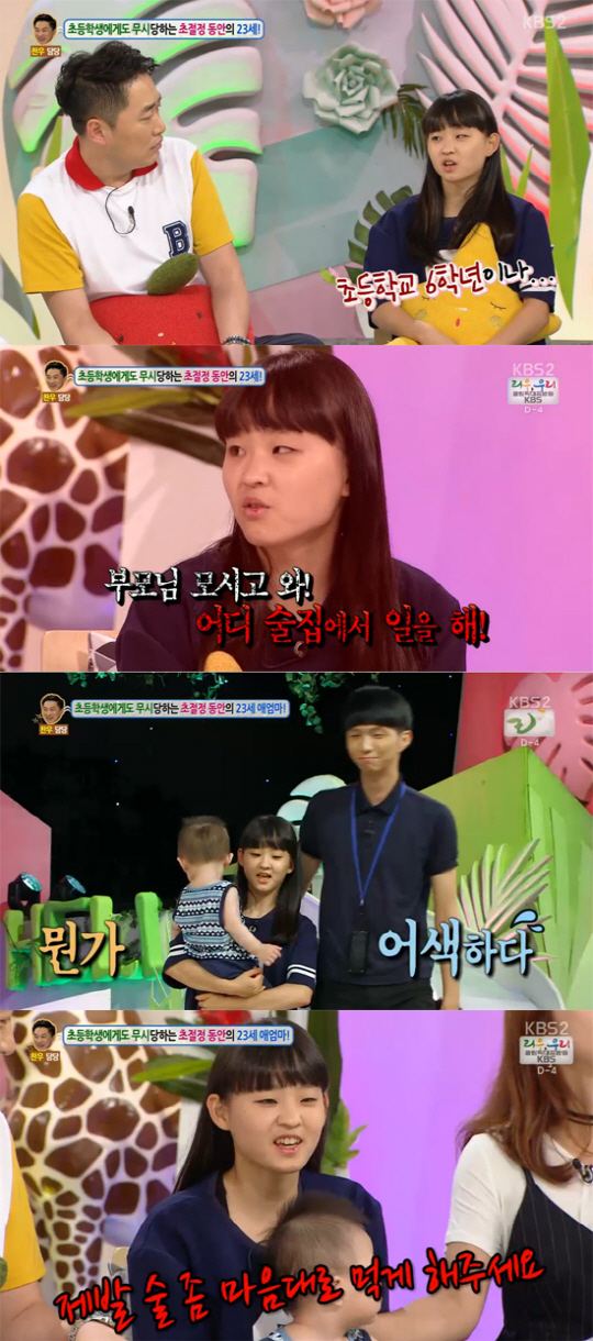 1일 방송한 KBS2 '안녕하세요'에는 작은 얼굴, 작은 키, 작은 몸, 어린 말투때문에 초등생들에게조차 무시 당하는 초동안 엄마가 출연해 고민을 털어놨다.