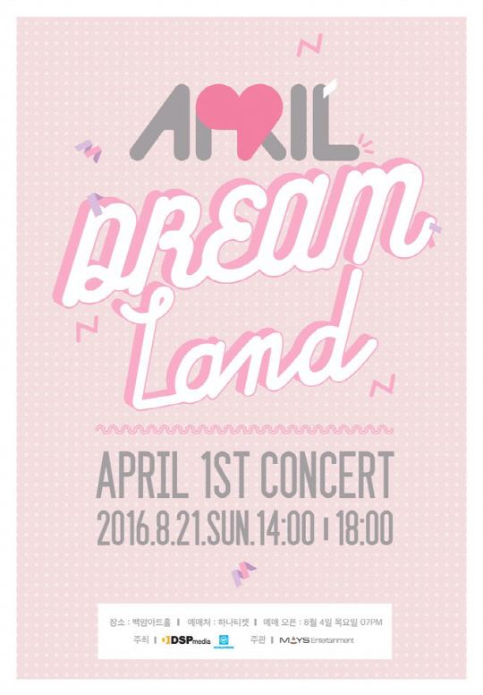 에이프릴의 소속사 DSP미디어 측은 2일 "에이프릴이 오는 21일 서울 강남구 삼성동 백암아트홀에서 데뷔 1주년 기념 단독 콘서트 '드림 랜드(Dream Land)'의 개최를 확정했다"고 공식적으로 밝혔다.