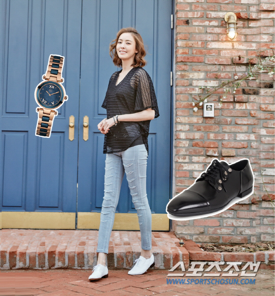이다희는 밝은 블루 컬러 팬츠에 어두운 컬러의 크로셰 니트를 매치해 시원해보이면서 스타일리시한 룩을 연출했다.