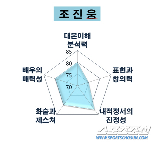 비단 이 부문 뿐 아니라 표현의 창의력 부문을 제외한 나머지 네개 부문에서 모두 만점이 고루 나온 점도 눈에 띄었다. 대본 이해 분석력 부문과 배우의 매력성 부문에서는 만점이 두 번 이상 나오기도 했다. 세계적 연출가이자 배우, 연극 이론가인 스타니스랍스키는 배우의 매력에 대해 '무대에 등장하는 순간 관객이 사랑하게 되는 배우를 본 적이 있는가. 이는 배우의 무대적 매력 때문이다. 배우의 단점마저 무대에서는 장점이 될 수 있는, 논리로 설명될 수 없는 배우의 특성이다'라고 설명한 적이 있다. '시그널' 등의 작품으로 아재파탈이라는 신조어까지 만들어낸 조진웅 역시도 이제 등장하는 순간부터 신뢰가 가고 호감을 이끌어내는 매력적인 배우가 되었다는 사실이 새삼 이번 '배우를 논하다'를 통해 증명되었다.