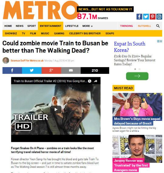 그리고 최근에도 해외의 호평은이어지고 있다. 1일 영국의 일간지 메트로의 시머스 더프(Seamus Duff) 기자는 "'부산행'의 좀비가 '워킹데드' 좀비를 능가할 수 있을까(Could zombie movie Train to Busan be better than The Walking Dead)?"라는 제목의 기사를 통해 신선한 재미를 느끼게 하는 '부산행'의 색다른 점을 설명했다.