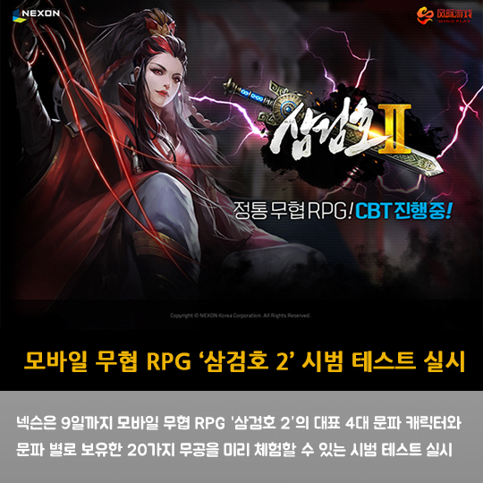 넥슨은 9일까지 모바일 무협 RPG '삼검호 2'의 대표 4대 문파 캐릭터와 문파 별로 보유한 20가지 무공을 미리 체험할 수 있는 시범 테스트 실시.