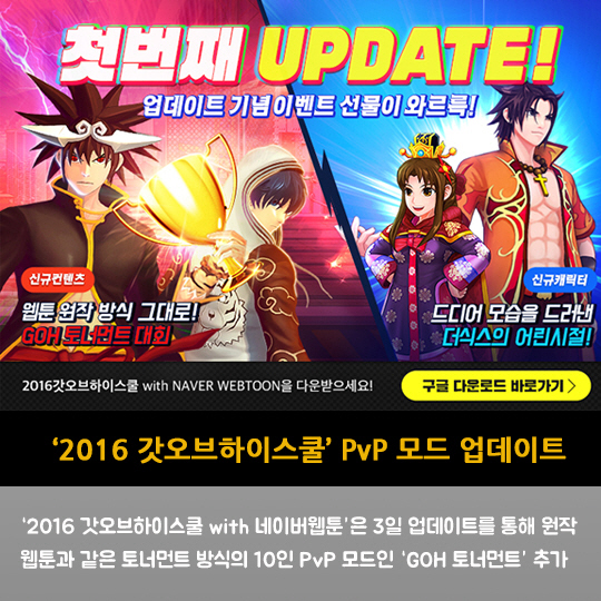 '2016 갓오브하이스쿨 with 네이버웹툰'은 3일 업데이트를 통해 원작 웹툰과 같은 토너먼트 방식의 10인 PvP 모드인 'GOH 토너먼트' 추가