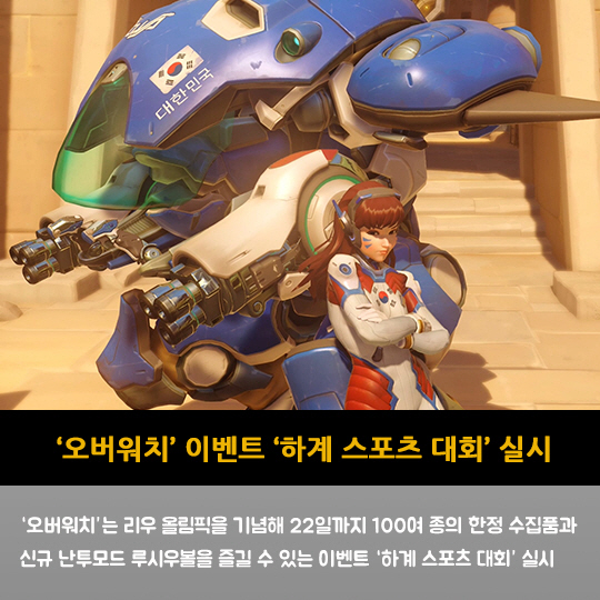 '오버워치'는 리우 올림픽을 기념해 22일까지 100여 종의 한정 수집품과 신규 난투모드 루시우볼을 즐길 수 있는 이벤트 '하계 스포츠 대회' 실시