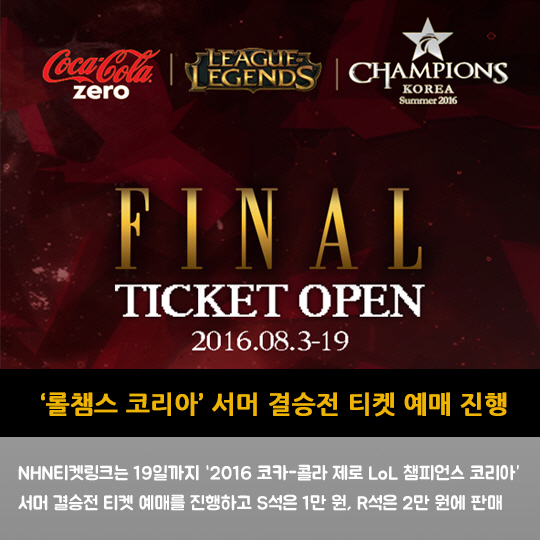 NHN티켓링크는 19일까지 '2016 코카-콜라 제로 LoL 챔피언스 코리아' 서머 결승전 티켓 예매를 진행하고 S석은 1만 원, R석은 2만 원에 판매