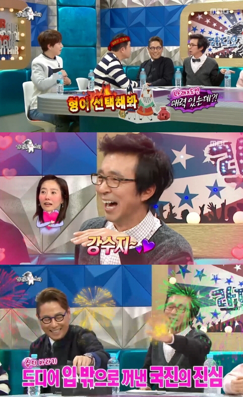 지난해 2월에는 강수지가 직접 '라디오스타'에 출연해 김국진과 남다른 '썸'을 보이며 스튜디오를 핑크빛으로 물들이기도 했다. 강수지는 김국진을 향해 "오빠~"라고 할 때 마다 웃음을 참지 못 했고 강수지에게 곤란한 질문이 쏟아지면 김국진이 먼저 나서서 정리하며 평소와 사뭇 다른 모습을 보여주기도 했다. 강수지는 이날 김국진에 대해 "오늘 오빠 때문이 마음이 좀 편한다. 남성미가 있다. 그러면서 자상하기도 하다. 오빠가 원래 모든 사람들에게 자상하다"고 애정을 드러냈다.