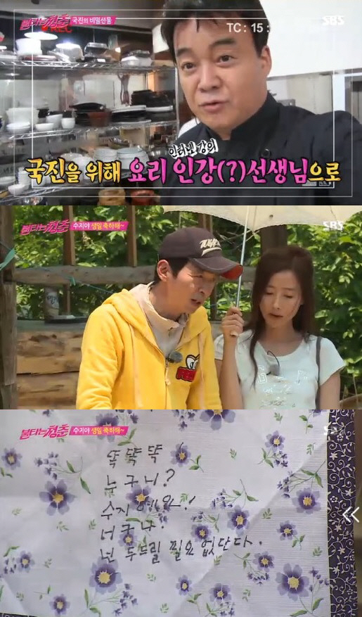 또한 김국진은 '불타는 청춘'에서 tvN '집밥 백선생'에서 배운 요리 실력을 바탕으로 강수지에게 화려한 생일상을 차려주는가 하면 보랏빛 손수건에 강수지를 향한 시를 적어 선물하기도 했다. 이에 강수지는 "남자에게 이런 생일상을 받아본 건 처음이다. 생일상을 88년까지 엄마에게 받았는데 그 이후로 엄마가 잊어버리셨다. 엄마가 생각이 났다"라며 눈물을 쏟기도 했다.