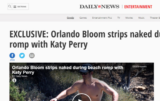 3일(현지시각) 미국 일간지 뉴욕데일리뉴스는 "지난 2일 알몸 상태인 올랜도 블룸이 케이티 페리와 이탈리아의 한 해변에서 물놀이를 즐기는 모습이 파파라치 카메라에 찍혔다"고 보도했다.