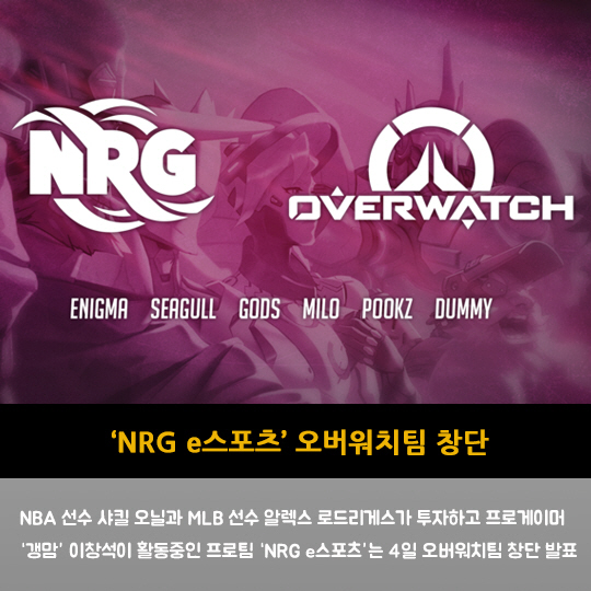 NBA 선수 샤킬 오닐과 MLB 선수 알렉스 로드리게스가 투자하고 프로게이머 '갱맘' 이창석이 활동중인 프로팀 'NRG e스포츠'는 4일 오버워치팀 창단 발표