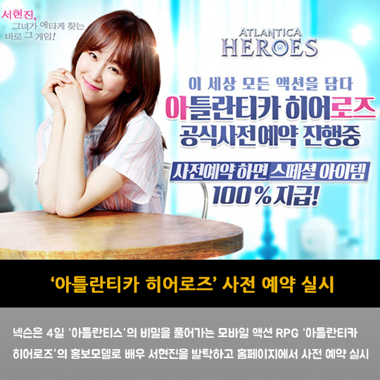 넥슨은 4일 '아틀란티스'의 비밀을 풀어가는 모바일 액션 RPG '아틀란티카 히어로즈'의 홍보모델로 배우 서현진을 발탁하고 홈페이지에서 사전 예약 실시