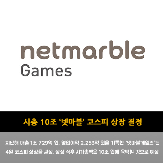 지난해 매출 1조 729억 원, 영업이익 2,253억 원을 기록한 '넷마블게임즈'는 4일 코스피 상장을 결정, 상장 직후 시가총액은 10조 원에 육박할 것으로 예상