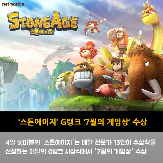 4일 넷마블의 '스톤에이지'는 매달 전문가 13인이 수상작을 선정하는 이달의 G랭크 시상식에서 '7월의 게임상' 수상