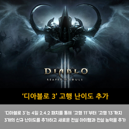 '디아블로 3'는 4일 2.4.2 패치를 통해 '고행 11'부터 '고행 13'까지 3개의 신규 난이도를 추가하고 새로운 전설 아이템과 전설 능력을 추가