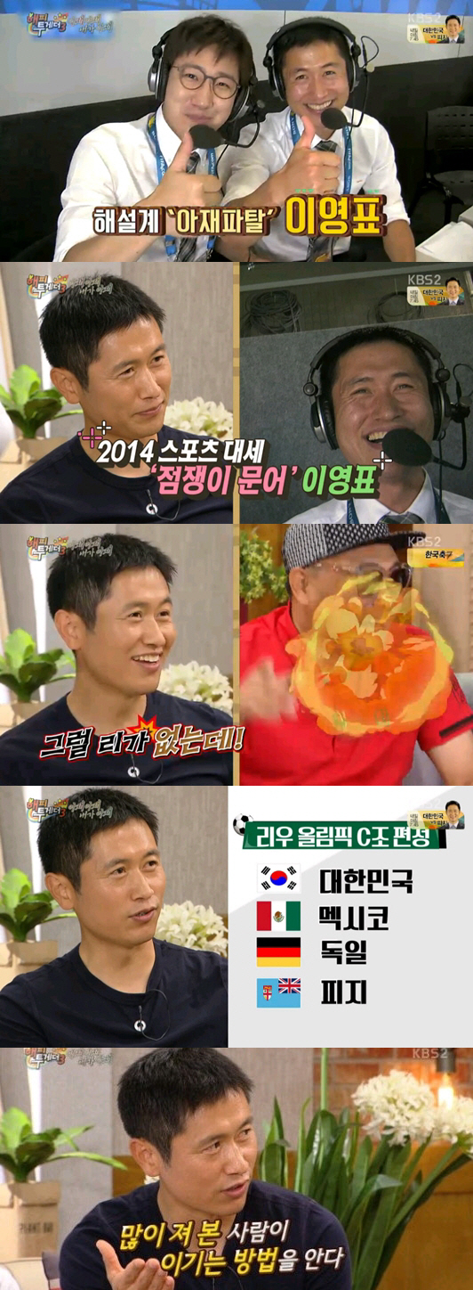 이영표는 연예계 대표 축구 애호가로 알려진 김흥국에게 거침없이 디스를 날렸다. 그는 최근 김흥국이 예능계의 대세로 떠오른 것에 대해 "현재 축구 지도자 연수를 위해 캐나다에 거주하고 있어서 전혀 몰랐다"며 "(소식을 듣고) 깜짝 놀랐다. 그럴 리가 없다고 생각했다"고 답해 김흥국에게 의문의 1패를 안겼다.
