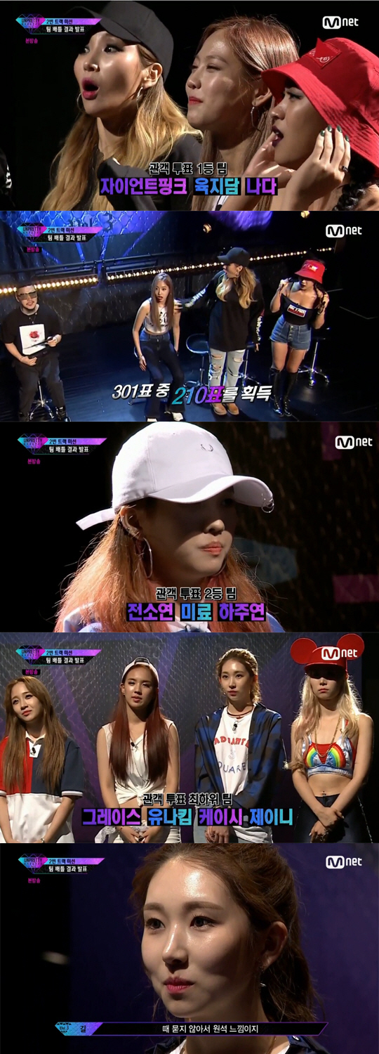 이날 팀 미션에선 '호랑나비'를 고른 자이언트핑크-육지담-나다 팀이 1위를 차지했다. 전소연 팀은 '남자이야기', 그레이스 팀은 '웃는게웃는게아니야'가 미션곡이었다.